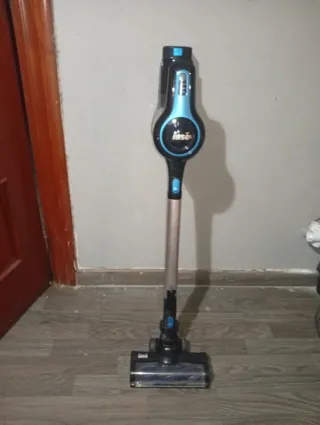 Recoger en ermua Aspirador escoba de la marca Inse, con un diseño moderno en color negro y azul. - Mango ergonómico. - Base con cepillo. - Indicador de batería.