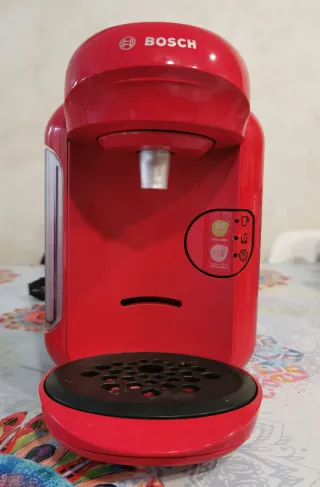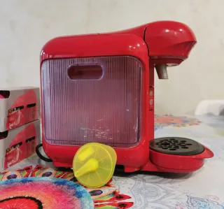 Cafetera Tassimo en color rojo, con un diseño compacto y moderno. - Indicador de nivel de agua. - Bandeja extraíble para facilitar la limpieza. - Botones de selección de bebida. - Se incluye un mix de cápsulas. (Las que se ven en la foto, ya que no la utilizo ya) - Las cápsulas estarán fuera de sus cajas. Ya que así me ocupan menos para guardar o enviar. ¡¡ Se aceptan ofertas. !!