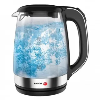 Hervidor de agua de cristal de la marca Fagor. Cuenta con un diseño moderno y funcional. - Capacidad máxima de 1.7L. - Indicador de nivel de agua. - Base giratoria. - Luz LED interior.