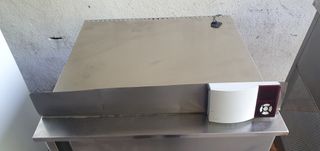 Se vende frigorífico bajo mostrador de acero inoxidable. Marca Docriluc. Se trata del modelo DDP-140. Puerta de apertura a derechas. Distribución interior: Tiene 3 guías para meter 3 cajoneras, especialmente suele ser de pescado (dispone de 2 unidades solamente). Se puede hacer uso de él como escarchacopas. Características: tensión monofásica 230V; frecuencia 50/60 Hz; intensidad 1,3 A; potencia 286W; gas refrigerante R134a (240 gramos); clase N; equipo hermético; condensación por ventilación; visor y controlador de temperatura electrónicos; etc. Medidas: 64,5 cms de ancho x 64 cms de fondo x 81,5 cms de altura (+9 cms programador).