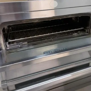 Horno profesional TurboChef de acero inoxidable. Cuenta con dos compartimentos de cocción independientes y puertas con ventana para supervisar los alimentos. - Construcción robusta en acero inoxidable. - Dos puertas con ventanas de visualización. - Diseño moderno y funcional.
