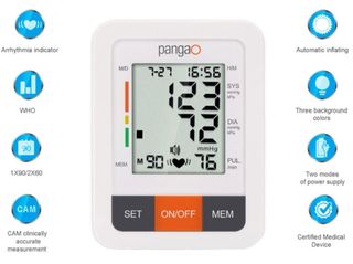 Tensiometro digital de la marca Pangao, ideal para mediciones precisas. - Indicador de arritmia. - Clasificación de la OMS. - Almacenamiento de 90 mediciones. - Inflado automático. - Tres colores de fondo. - Dos modos de suministro de energía. - Certificado como dispositivo médico.