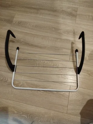 Tendedero compacto y práctico, ideal para espacios reducidos como balcones o ventanas. Fácil de colgar y guardar. - Estructura metálica. - Dos soportes de plástico negro. - Cuatro barras de secado.