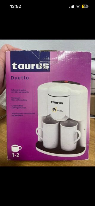 Cafetera Taurus Duetto, ideal para preparar café. -Cafetera de goteo con filtro permanente y extraible - Color blanco. - Diseño compacto. -Incluye 2 tazas -Depósito de agua fácil de llenar.