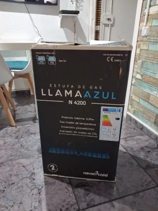 Estufa de gas Llamazul modelo N 4200, preparada para gas butano. - Potencia máxima de 4,2Kw. - Tres niveles de temperatura. - Encendido piezoeléctrico. - Analizador de niveles de CO₂. - Categoría: 13+.