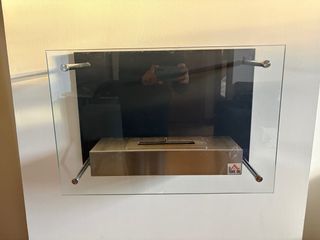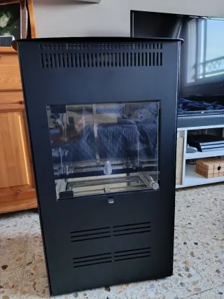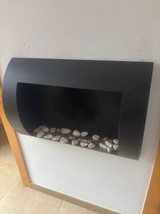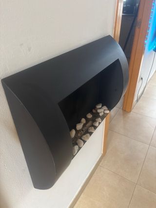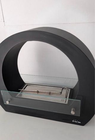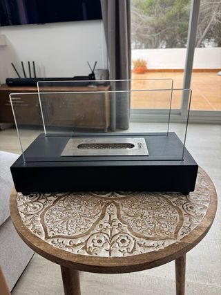 Elegante estufa de bioetanol con un diseño moderno y estilizado. Aporta un toque acogedor a cualquier espacio. - Acabado en color negro. - Combina cristal y metal. Tiene tan solo dos años. Funciona perfectamente, está nueva solo se ha usado ocasionalmente porque es segunda residencia. La cambiamos porque pusieron chimeneas en el edificio y hemos cambiado de tipo de estufa.