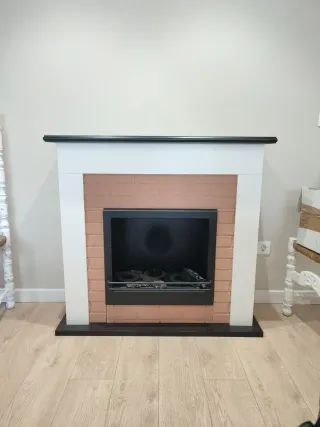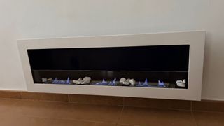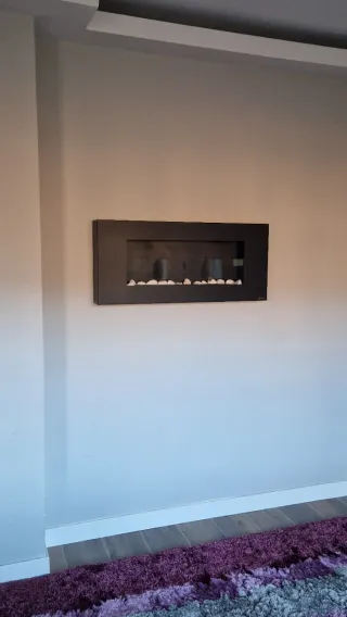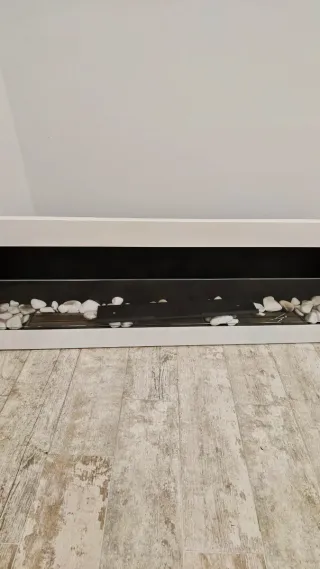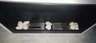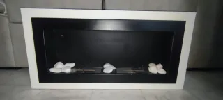 Elegante estufa de bioetanol, casi nueva, con un diseño moderno que combina acabados en negro y blanco. Aporta un toque acogedor a cualquier espacio. - Marco exterior en color blanco. - Panel interior en color negro. - Elementos decorativos de piedra. El bioetanol es limpio, cómodo y rápido de encender. No genera olores ni necesita salida de humos, y no tiene el peligro de generar exceso de O2 como la de butano.