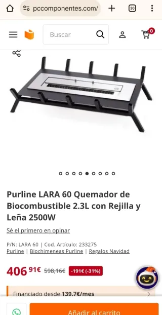 Quemador de bioetanol Purline LARA 60. Biocombustible 2.3L 2500W Diseñado para su uso en chimeneas tradicionales, de forma que no produzca humos ni suciedad. Para una autonomía de 5 a 6 horas de caldeo con aproximadamente 2.3 L de bio etanol líquido. Rejilla soporte de acero Leños cerámicos resistentes a altas temperaturas Quemador fabricado en acero inoxidable. Ajuste de la altura de las llamas regulando la apertura de la tapa. Fibra cerámica Medidas (sin los leños): L59 x P35.5 x H13.6 cm Peso: 9 Kg. Si precio en tiendas 406€ En nuestro almacén de liquidaciónes 80€ Ha sido de exposición y probado con el etanol.