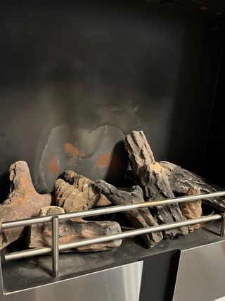 Chimenea de bioetanol con un diseño moderno y elegante. Incluye troncos decorativos de cerámica para un ambiente acogedor. - Estructura metálica. - Tres quemadores