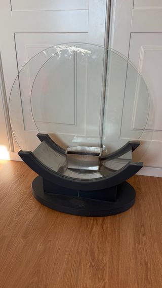 Elegante chimenea de bioetanol con un diseño moderno y sofisticado. - Base circular. - Estructura curva de metal. - Panel frontal de cristal transparente. - Compartimento central de metal. Muy poco uso, regalo botella de bioetanol.