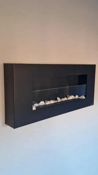 Chimenea de bioetanol para colgar en la pared. Diseño moderno y elegante. - Marco exterior en color gris. - Interior en negro