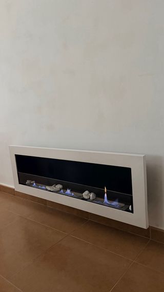 Chimenea de bioetanol con un diseño moderno y elegante. Se compro para un piso y dividir el salon con el comedor, se ha usado 3 o 4 veces contadas. Ahora la tenemos mas bien de decoracion y nos empieza a estorbar. Se compro hace 5 años y su valor fue el que se ve en la imagen, se vende por 1200€. se puede negociar algo el precio. - Estructura principal en color blanco. - Frontal y trasera de vidrio templado transparente. - Deposito extraible de gran capacidad No incluido pero lo regalamos - Piedras decoritavas - Luces led si se quiere no encender - Mechero de diseño recargable Medidas: 94x45x99 Peso aprox: 100 kg