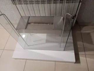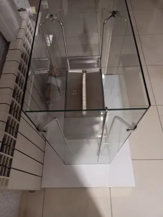 Elegante chimenea de bioetanol con un diseño moderno. - Estructura principal en color negro. - Acabados en cristal transparente. - Detalles metálicos. -tiene piedras para poner en el interior - tan solo esta para limpiar bien las ranuras del cristal y estructura