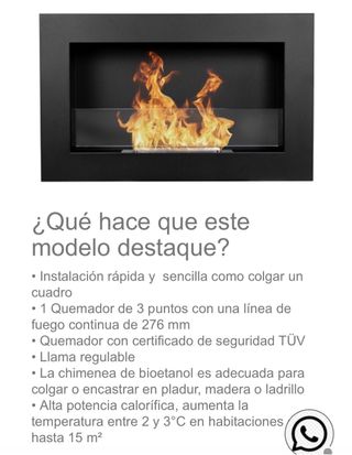 Elegante chimenea de bioetanol con un diseño moderno y minimalista. Perfecta para añadir un toque acogedor a cualquier espacio. - Marco exterior en acabado metálico. - Interior con detalles de piedras blancas. - Panel frontal de cristal. - Dos quemadores con algodón para alargar el líquido de bioetanol. - Fácil instalación como si fuera un cuadro y también se puede encastrar en Pladur. - Se regala 4 botellas de 1L cada una de bioetanol. - Medidas 90x 40 x 12 más detalles en la última foto.