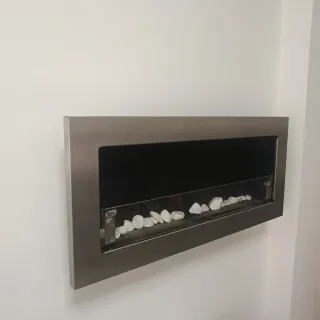 Chimenea de bioetanol con un diseño moderno y elegante. Fácil de instalar, se cuelga como un cuadro. - Quemador de 3 puntos con línea de fuego continua de 276 mm. - Quemador con certificado de seguridad TÜV. - Llama regulable. - Adecuada para colgar o empotrar en pladur, madera o ladrillo. - Alta potencia calorífica, aumenta la temperatura entre 2 y 3°C en habitaciones hasta 15 m².