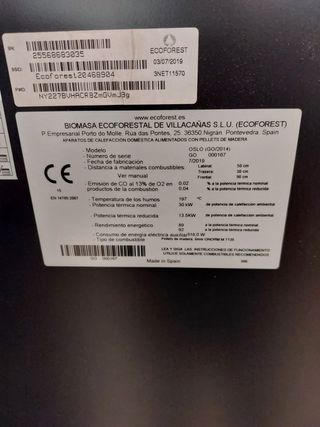Piezas de repuesto para estufa de biomasa Ecoforest modelo Hidrocopper. Disponible: resistencia encendido, puerta principal, motor sinfín pellets, vaso de expansión, cableado, motor extractor humos, etc. Consultar por pieza deseada. - Fabricante: Biomasa Ecofurestal de Villas Sampaio Areeiro. - Modelo: Hidrocopper. - Número de serie: 57312-4. - Año de fabricación: 2009. - Certificación: DIN EN 14785, P8-240/2007, P8-241/2007. - Temperatura máxima del agua: 80° C. - Presión de trabajo: 1,5 bar. - Presión máxima: 3,0 bar. - Consumo eléctrico: 230 V, 50 Hz, 500 W, IP20. - Combustible: P