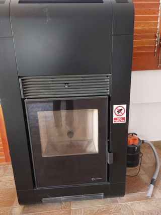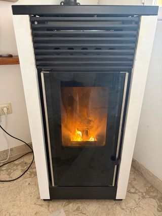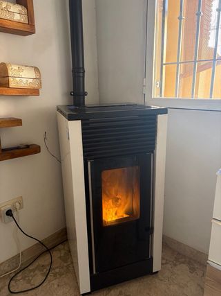 Estufa de biomasa con sistema de autolimpieza. Marca CS thermos - Diseño moderno en dos tonos. - Acabado brillante. -Como nueva, usada 3 veces. -Incluidos en la venta 4m aprox. de tubería exterior.