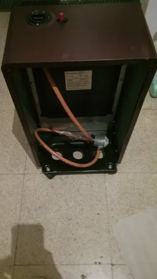 Estufa de gas portátil con ruedas para facilitar su movilidad. Ideal para calentar espacios. - Color marrón oscuro. - Manguera de gas naranja incluida. - Ruedas en la base.