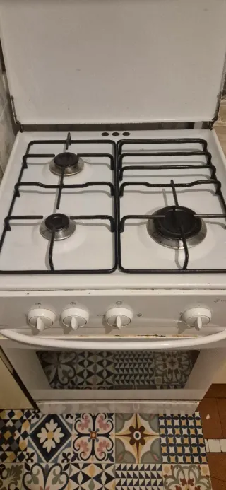 Cocina de gas natural Edesa. usada, pero funciona bien. Se puede usar con gas butano, pero hay que cambiar los injectores , está diseñada para funcionar con gas ciudad, gas natural. Tiene horno y 3 quemadores. Muestra señales de haber sido usada. Es antigua pero funciona, por eso la vendo barata - Funciona con gas natural. - Encimera blanca con tres quemadores. - Horno con puerta de cristal. - Mandos frontales. - Marca Edesa.