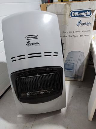 Estufa a gas DeLonghi con control de temperatura variable. Diseño moderno y compacto. Llama azul - Control de temperatura variable. - Encendido con chispa electronica. - Ruedas para fácil movilidad. Tengo dos. Uno de ellos le falta una rueda y la tapa trasera. Son de gran potencia para interiores. En buen estado Funcionan sin problemas El precio si te llevasos dos es negociable. Nuevos son caros así q nada de regateos abasurdos
