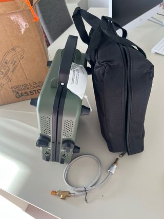 Estufa de camping portátil de gas con dos quemadores. Ideal para exteriores y viajes. - Diseño compacto y plegable. - Incluye manguera y regulador. - Construcción robusta para mayor durabilidad.