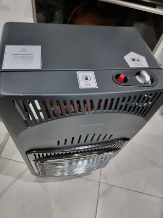 Estufa de gas portátil, ideal para calentar espacios. - Diseño moderno en color gris. - Panel frontal con rejilla. - Controles en la parte superior.