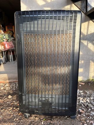 Estufa de gas de color negro, ideal para calentar espacios. - Diseño moderno y funcional. - Rejilla protectora frontal.