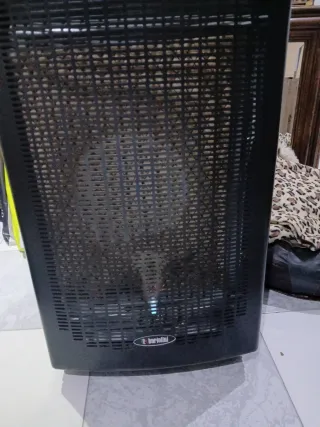 Estufa de gas butano en perfecto estado. Es de color negro y está fabricada en metal. - Dispone de ruedas para facilitar su movilidad. - Incluye rejilla protectora. - Diseño compacto y elegante.