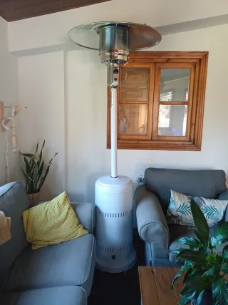 Estufa de exterior con un diseño moderno y funcional. Ideal para mantener el ambiente cálido. - Fabricada con materiales resistentes. -Color blanco. -Esta sin estrenar, la compramos y montamos para poner en una terraza cubierta y luego nos dimos cuenta de que solo servía para exteriores, 😞 ni la hemos encendido. -Precio negociable