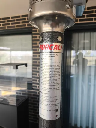 Estufa de gas tipo seta para exteriores, ideal para patios y terrazas. Proporciona calor de manera eficiente. - Marca: Forcali - Color: Gris y plateado - Materiales: Metal y plástico