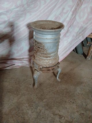 Estufa de leña de estilo antiguo, con un diseño robusto y detalles metálicos. - Estructura principal de metal. - Revestimiento exterior blanco con signos de uso. - Tapa superior circular. - Aro decorativo superior con barras verticales. - Para más información llamad al número 643046683