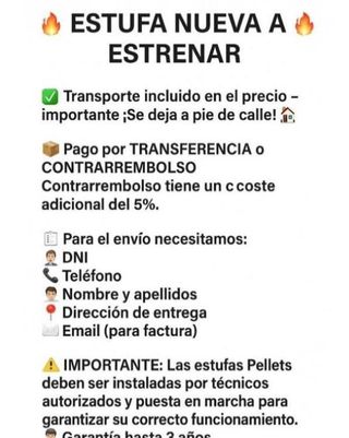 🔥 Caldera Policombustible BOILER 34 – Leña, Pellets y Hueso de Aceituna 🔥 📌 Referencia: CAL209001 | Clase energética: A+ ⚡ Potencia: 34 kW / 29.000 kcal/h | Eficiencia: 78,4 % 🌡️ Temperatura de operación: 80–65 °C | Máxima: 95 °C 💧 Presión: máx. 3 bar / mín. 1,5 bar 🪵 Carga manual (leña) y automática (pellets o hueso de aceituna) 🧱 Puertas revestidas en piedra refractaria 🔥 Válvula anti-retorno de llama | ⏱️ Programable 📐 Medidas: 1530×1280×907 mm | Salida humos Ø200 mm 🛢️ Depósito: 120 L | Peso: 400 kg 🏭 Norma: EN 303-5 | Ideal para uso doméstico o industrial ✅ Transporte incluido se deja pie de calle
