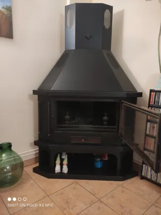 Vendo Chimenea de leña , RINCONERA , se encuentra a 100 km de Madrid , en perfecto estado como se muestra en las fotos , tiene dos salidas de aire Arriba y en la parte baja , también cuenta con almacenamiento para leña en la parte baja , una salida de conducto superior , las medidas son las siguientes . Medidas : anchura 1,26 cm Profundidad : 49 cm Puerta : 68 cm Precio algo negociable . Recogida a cargo del Comprador . No se Envía.