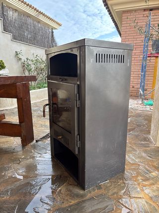 Chimenea de leña con un diseño robusto y funcional, ideal para espacios exteriores o interiores adaptados. - Puertas frontales de cristal para visualizar el fuego. - Estructura principal de metal. - Detalles decorativos en terracota y madera. EN EL PRECIO SE INCLUYE SALIDA DE HUMO