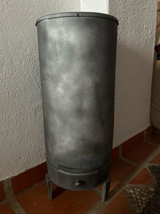 Estufa de leña de diseño cilíndrico. - Material metálico. - Color gris.