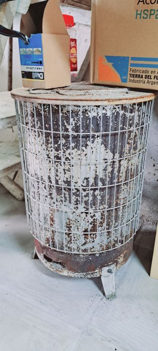 Estufa de leña de estilo rústico, ideal para dar un toque vintage a tu hogar. - Fabricada en metal. - Diseño cilíndrico con rejilla protectora. - Tapa superior con asa. - Base con patas.