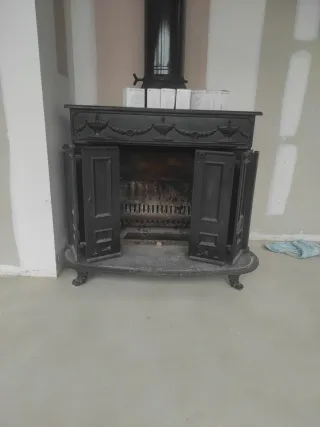 Estufa de leña de hierro fundido con un diseño clásico y elegante. Perfecta para dar un toque rústico y acogedor a tu hogar. - Acabado en negro mate. - Puertas frontales abatibles. - Base con ruedas para facilitar su movilidad.
