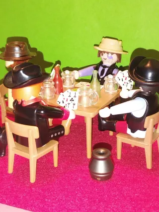 Foto 1; Figura de Playmobil de un sheriff del oeste, lista para añadir a tu colección. - Incluye sheriff con chaleco y sombrero. - Accesorios como cubeta y tetera. - Figura de gato blanco y negro. - Silla mecedora de madera. - Estufa de leña con chimenea. Foto 2-5; partida póker, oeste saloon, precio 17€