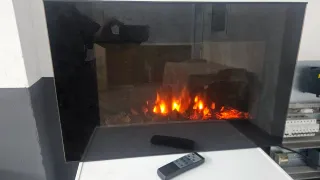 Calefactor eléctrico con un diseño moderno que simula el efecto de leña encendida. - Marco frontal de cristal negro. - Mando remoto - salida superior