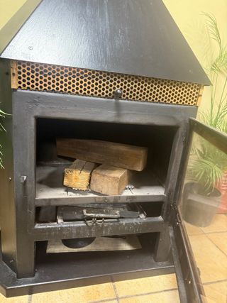 Vendo chimenea de leña en buen estado regalo el mueble de almacenaje de leña de metal y los utensilios también que aparecen en la foto. Bajada de precio