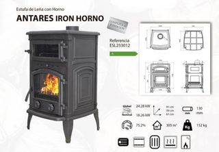 🔥 Estufa de leña con horno ANTARES IRON HORNO – Completa en fundición 🔥 🍕 ¡Cocina y calienta tu hogar con estilo rústico y máxima eficiencia! ♨️ Ideal para casas rurales, salones amplios y espacios tradicionales 🔥 Potencia global: 24.28 kW ⚙️ Potencia nominal: 18.26 kW 📈 Rendimiento: 75.2 % 🏠 Calienta hasta: 305 m3 📐 Dimensiones: 91 × 59 × 61 cm 🔁 Salida de humos: Ø130 mm ⚖️ Peso: 152 kg 🧱 Material: Fundición completa (alta durabilidad y retención de calor) 🍞 Incluye horno integrado: ideal para asados, pan, pizzas y mucho más 🔥 Rejilla de leña | ♨️ Regulación de aire | 🪟 Puerta con cristal vitrocerámico