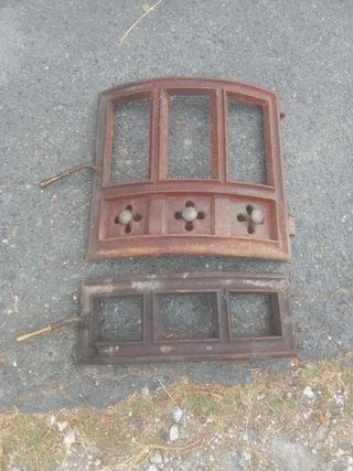 Juego de dos puertas de hierro fundido para estufa de leña. Son piezas antiguas con un aspecto rústico y desgastado por el tiempo. - Ideales para restaurar o usar como elemento decorativo. - Se venden juntas. - Fabricadas en hierro fundido resistente.