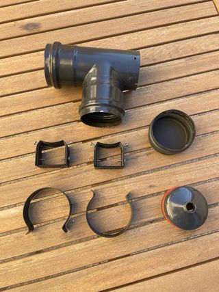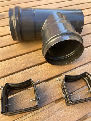 Conjunto de piezas para estufa de pellets. - T de conexión. - Cierres y abrazaderas. - Tapa de salida.