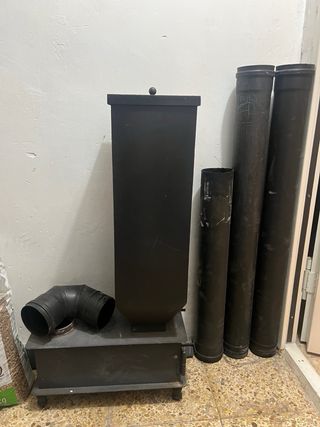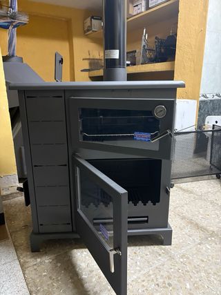 Para leña,pelets, piñoned y cascaras. Con horno. Necesita una limpieza A fondo pero funciona perfecta. Hierro. Solo tiene 2 años