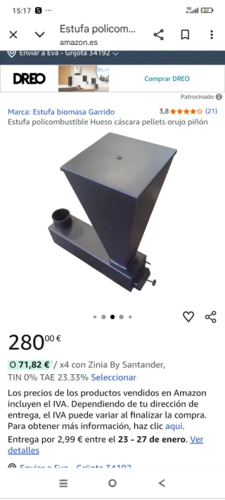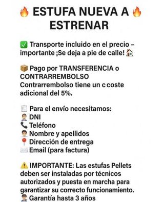 Se vende estufa de pellets con solo dos inviernos de uso, se vende por no usarse. CARACTERISTICAS: -Policombustible: admite como combustible el pellet, el hueso de aceituna y la cascara de almendra -Con conexion a internet con WIFI para su uso a traves de la app -Bajo consumo electrico, etiqueta eficiente A+ -9,5KW -Control por potencia o por temperatura ambiente -Rendimiento 91,8% -Tolva: 15kg EXTRAS: -Usillos originales de la marca ECOFOREST para pellet y para hueso de aceituna - 2 metros de tubo para la salida de humos + codos + embellecedor interior y exterior + chimenea exterior -Aspiradora para la limpieza y mantenimiento de la estufa -Se adjuntan los 2 libros originales para su puesta en marcha y funcionamiento + limpieza y mantenimiento