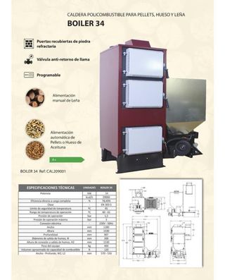 🔥 Caldera Policombustible BOILER 34 – Leña, Pellets y Hueso de Aceituna 🔥 📌 Referencia: CAL209001 | Clase energética: A+ ⚡ Potencia: 34 kW / 29.000 kcal/h | Eficiencia: 78,4 % 🌡️ Temperatura de operación: 80–65 °C | Máxima: 95 °C 💧 Presión: máx. 3 bar / mín. 1,5 bar 🔌 Alimentación: 230 V – 50 Hz 🪵 Carga manual (leña) y automática (pellets o hueso de aceituna) 🧱 Puertas revestidas en piedra refractaria 🔥 Válvula anti-retorno de llama | ⏱️ Programable 📐 Medidas: 1530×1280×907 mm | Salida humos Ø200 mm 🛢️ Depósito: 120 L | Peso: 400 kg 🏭 Norma: EN 303-5 | Ideal para uso doméstico o industrial