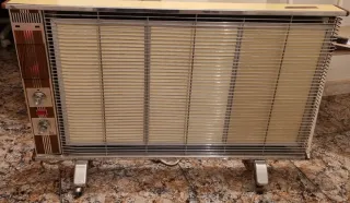 Estufa eléctrica de diseño retro, ideal para calentar espacios. - Color negro y detalles metálicos. - Dos ruedas para facilitar su movilidad. - Panel frontal con dos perillas de control.