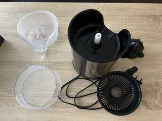 Exprimidor para cítricos con dos tamaños diferentes de exprimidor. Válido para limas, mandarinas, naranjas, pomelos, etc... Fácil de limpiar ya que todas las piezas se desmontan y se pueden lavar en lavavajillas. Encendido y apagado automático. Le falta la caja pero está completamente nuevo.