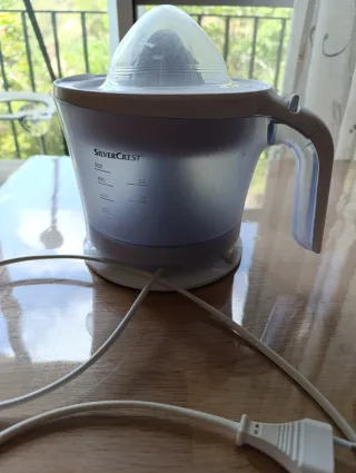 Exprimidor eléctrico de la marca SilverCrest, ideal para preparar zumos frescos. - Diseño transparente. - Capacidad de hasta 600 ml. - Incluye tapa. - Base antideslizante.