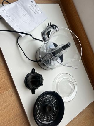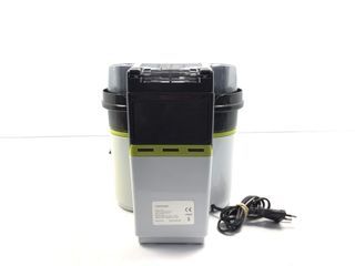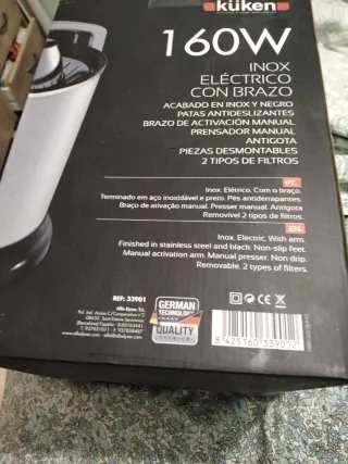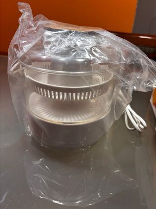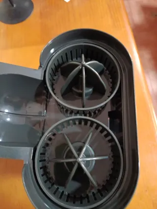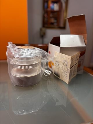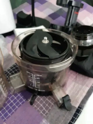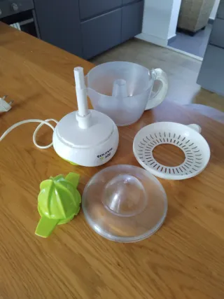 Defectuoso de fábrica no gira bien. Hace ruido y gira pero no todo el rato. Por lo que su uso ha sido manual y en contadas ocasiones. Se puede lavar en lavavajillas, se rompió también uno de los 3 enganches de una de las 2 piezas exprimidoras, ver foto. Está completo. Vendo las 6 piezas por 3€. Por si alguien le puede dar uso o arreglo. - Diseño en color crema y naranja. - Capacidad de 1.2 L. - Marcador de nivel de líquido - Tamaño compacto - Recogecables y tapa - 2 boquillas de diferente tamaño HAGO ENVÍOS rápidos y lotes por Wallapop. Entrega en zona Bagatza.